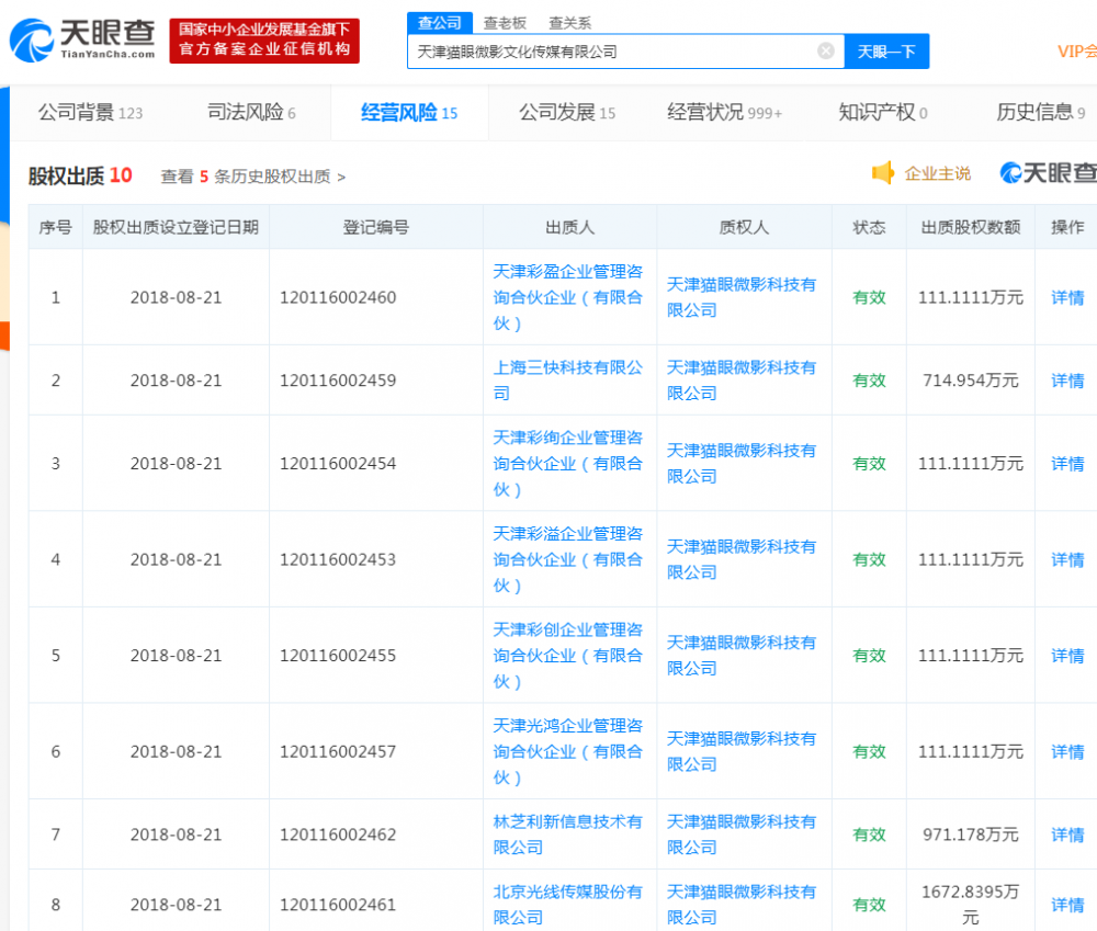 天眼查显示,2018年为了融资,出现过高达10次股权出质事件,2019年初,互联网公司扎堆上市,估值必然不会太高,可猫眼依旧匆匆上市,一切行为只为尽快回血。