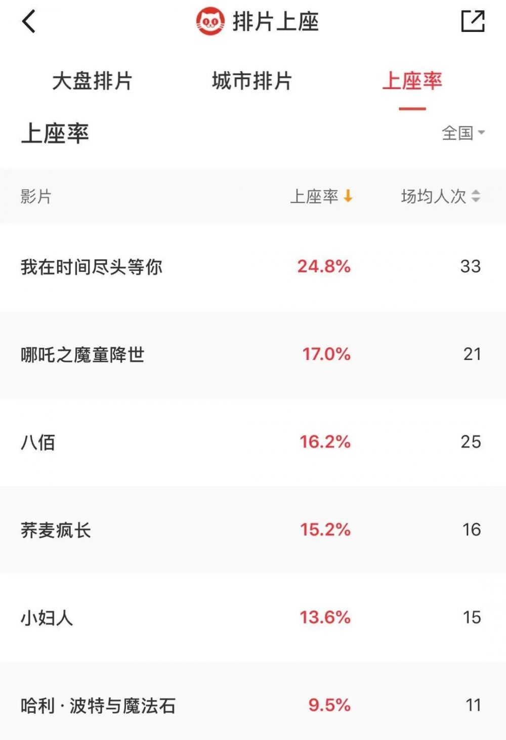 从猫眼娱乐专业版的上座排名可以看出,仅5部电影上座率超过两位数,哈利波特影迷们心中的“白月光”上座率才9.5%。