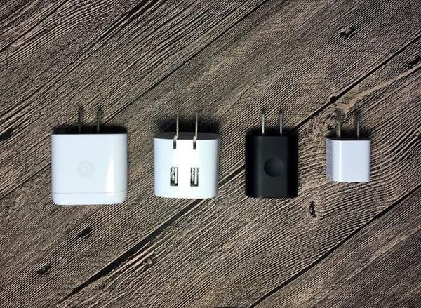 (从左到右依次为金立M6快充充电器、公牛自动防过充USB充电器、诺基亚N1充电器、iPhone 6充电器)