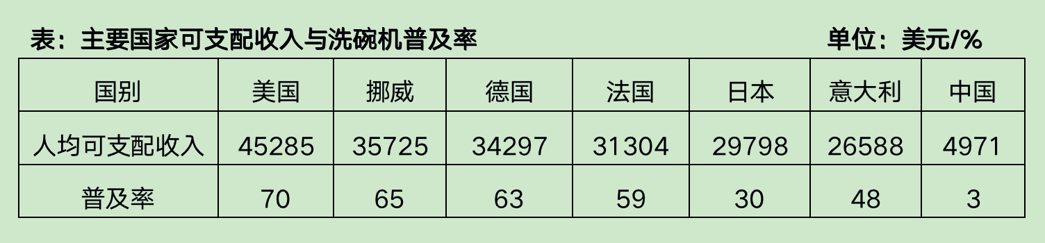 从表中可以看出洗碗机的普及率与居民的可支配收入来看,两者是一种正相关的关系。居民可支配收入高,洗碗机的普及率就会比较高。现在,我国正处经济高增长时期,随着居民收入的不断增加,洗碗机普及率会随着提升。