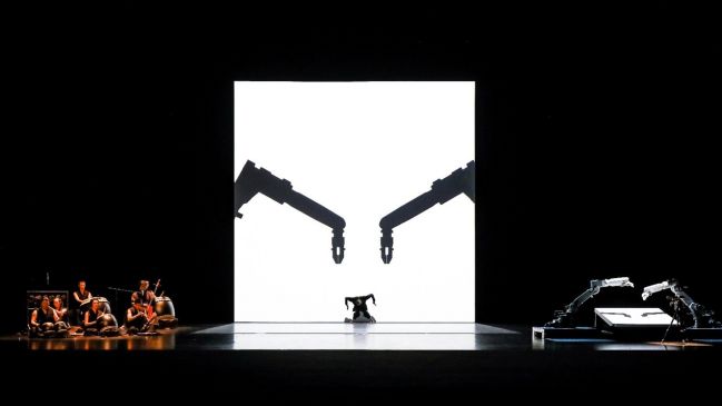 首个作品选自《对话. 寓言2047》第二季作品《神鼓. 影》。在富有节奏感的鼓声中,机械臂模仿人类的肢体动作,通过投影与舞者李宇实时互动。与此同时,远处传来人声呼麦,古老的声乐形式与机械工业感的舞台呈现交相呼应,展现人工智能时代,科技如何为人类奏出美好的和音。机械臂由简入繁,模仿舞者动作,舞者逐渐依赖机械臂,当机械臂逐渐失去控制,舞者彷徨陷入困局。作品围绕“人与科技的关系将何去何从”这一命题,在人性本质与科技裂变之间展开对话。