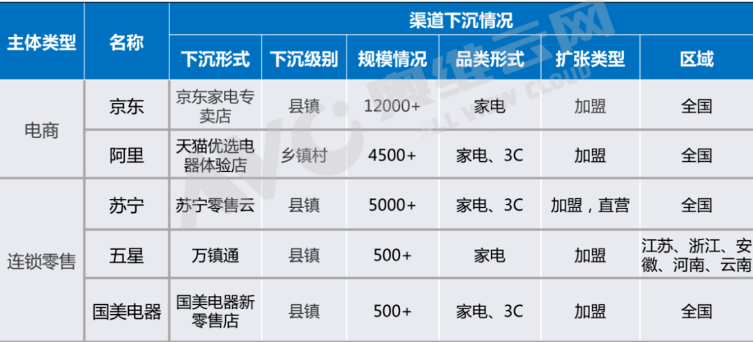 第一,渠道进一步下沉。下沉主要集中在电商渠道和连锁零售渠道方面,当地传统专业家电经销商通过加盟形式,融入到电商或连锁零售体系之中。一、二、三级空调市场,相对稳定,具有增量需求的用户,基本上都局限在四、五市场。因此,此番渠道下沉是战略性的转移,基本上都是互联网平台和连锁卖场的再次跑马圈地。(见表一)