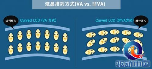 曲面电视的核心是垂直液晶排列技术 VA(Vertical Alignment)。通过向液晶材料施加电压,使液晶材料排列方向发生改变,光线便无法穿透,遮住光源进而实现最终成像。液晶物质垂直排列时,即使发生物理弯曲,也几乎不会发生漏光或斑点等现象。因此曲面电视搭载了垂直液晶排列技术的LCD panel。
