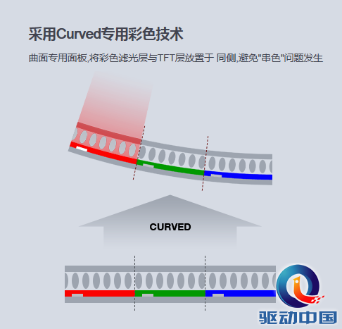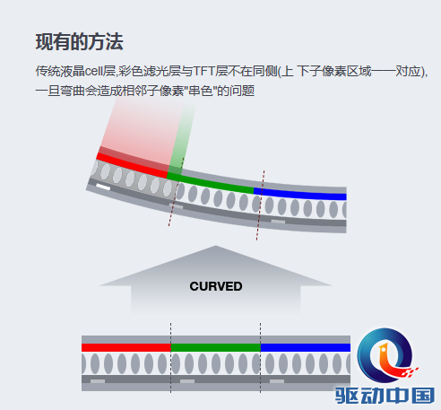 曲面显示屏因其特殊的形态,所以上基板TFT(薄膜晶体管)和下基板彩色滤光片(color filter)之间的错位咬合排列显得尤为重要。上下基板无法实现精准错位咬合排列时,画面将出现漏光、混色等问题。因此研发出满足黄金曲率的最佳像素以及使上下基板实现完美错位咬合排列也是不可忽视的一个环节。