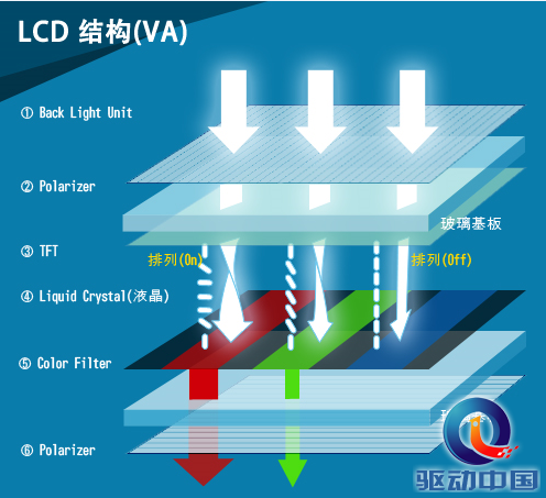 LCD的构造是在两片平行的玻璃基板中放置液晶盒,上基板玻璃上装置TFT(薄膜晶体管),下基板玻璃上装置红、黄、绿三原色彩色滤光片(color filter),加载背光源(back light)及偏光板(polarizing plate)。