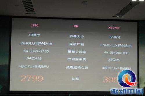 发布会上虐友商,已是大家惯用手法,只是酷开U50可以说将友商虐的连渣都不剩。发布会上,酷开将这款新品与X50Air进行了对比,两款产品均为50英寸4K智能电视,分辨率为3840*2160像素,屏幕也都是由INNOLUX群创光电面板厂商提供。不同的是,酷开U50搭载的是64位A53处理器架构,处理器核心数为4核CPU+8核GPU。而X50Air则搭载了32位A9处理器架构,处理器核心数为4核CPU+4核GPU。更大的区别是,酷开U50仅售2799元,而且还无捆绑、无运费,而X50Air的售价高达3999元。