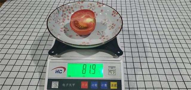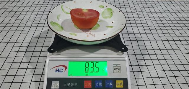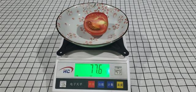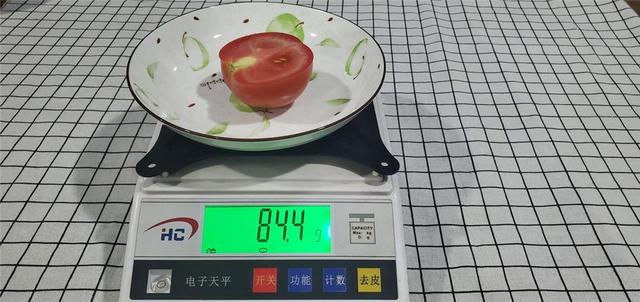 我们先将西红柿切成两半,其中一半刚切开时的重量为84.4g,这一半我称重完毕后就放进了冰箱内部冷藏。