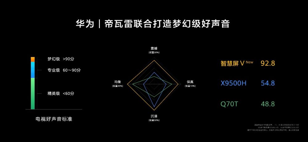 与此同时,华为联合帝瓦雷定义了业内首个电视好声音标准,从震撼、均衡、保真、沉浸四大维度出发,基于各要素的不同权重对电视音质进行专业评级,由高到低定义了梦幻级(大于90分)、专业级(60-90分)、精英级(小于60分)三重音质水准。评定结果显示,新一代华为智慧屏V系列65英寸、75英寸、85英寸机型得分均高于90分,获得梦幻级好声音认证,55英寸机型获得专业级好声音认证。
