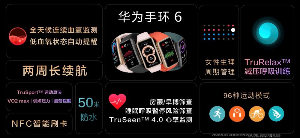 此次发布会还正式发布了边框更窄,屏幕更大,功能更丰富的华为手环6。采用全面屏设计,相比上一代显示面积提升近1.5倍,屏幕视野更开阔,尽观精彩;支持全天候血氧、心率、睡眠、压力监测,以及与301医院深度合作,可参与其心脏健康研究和睡眠呼吸暂停风险筛查研究,贴腕守护健康生活;96种运动模式,新增跳绳运动,支持自动识别与专业算法,让科学运动抬腕可及。轻盈机身蕴含澎湃能量,典型使用场景使用,充电1次续航2周,磁吸式快充5分钟可使用2天,强悍续航加持,时时尽享腕上智慧生活。