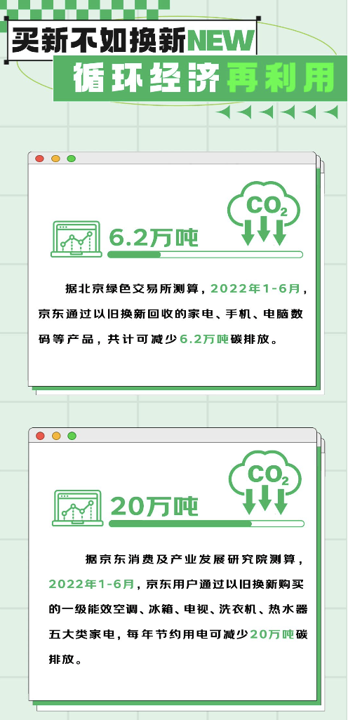 在此背景下,以旧换新作为绿色消费的重要抓手,不仅能够节省用户焕新成本、激发消费者焕新动力,还让“旧物”不再是“废物”,有效降低电器产品的碳排放量。据北京绿色交易所以及京东消费及产业发展研究院测算,仅2022年1-6月,京东电器通过以旧换新推动减少碳排放26.2万吨,其中包括以旧换新回收的家电、手机、电脑数码等减少的碳排放6.2万吨,京东用户通过以旧换新购买的一级能效空调、冰箱、电视、洗衣机、热水器五大类家电,每年节约用电减少的碳排放20万吨。