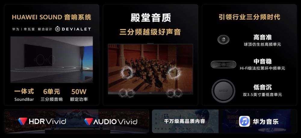 新品在画质技术迎来全新升级,在音质上采用6单元音响系统,一体式SoundBar,帝瓦雷SAM技术的智能低音算法,让 V 三代独具好声音气质。澎湃重低音,自带听交响乐的好音响,引领电视行业进入三分频时代。HUAWEI SOUND 计算音频,音随画动还原视听现场。比如,赛车场景下,能够将赛车迎面而来,飞驰而去等场景的音效逼真还原。还能够识别人物脸型及口型,在双人或多人对话的场景,能使用户感受到不同人物在画面中的位置感。同时,利用声场建模,自动匹配空间场景下的音效方案,为用户缔造专属声场。