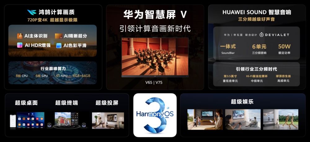 计算能力是高端电视的分水岭。据悉,华为智慧屏 V 3代具有顶级性能、鸿鹄计算画质、澎湃音质、HarmonyOS超级娱乐、HarmonyOS智慧体验。它搭载全新升级的HarmonyOS 3操作系统,将为用户带来革命性的智慧交互和全能娱乐体验。