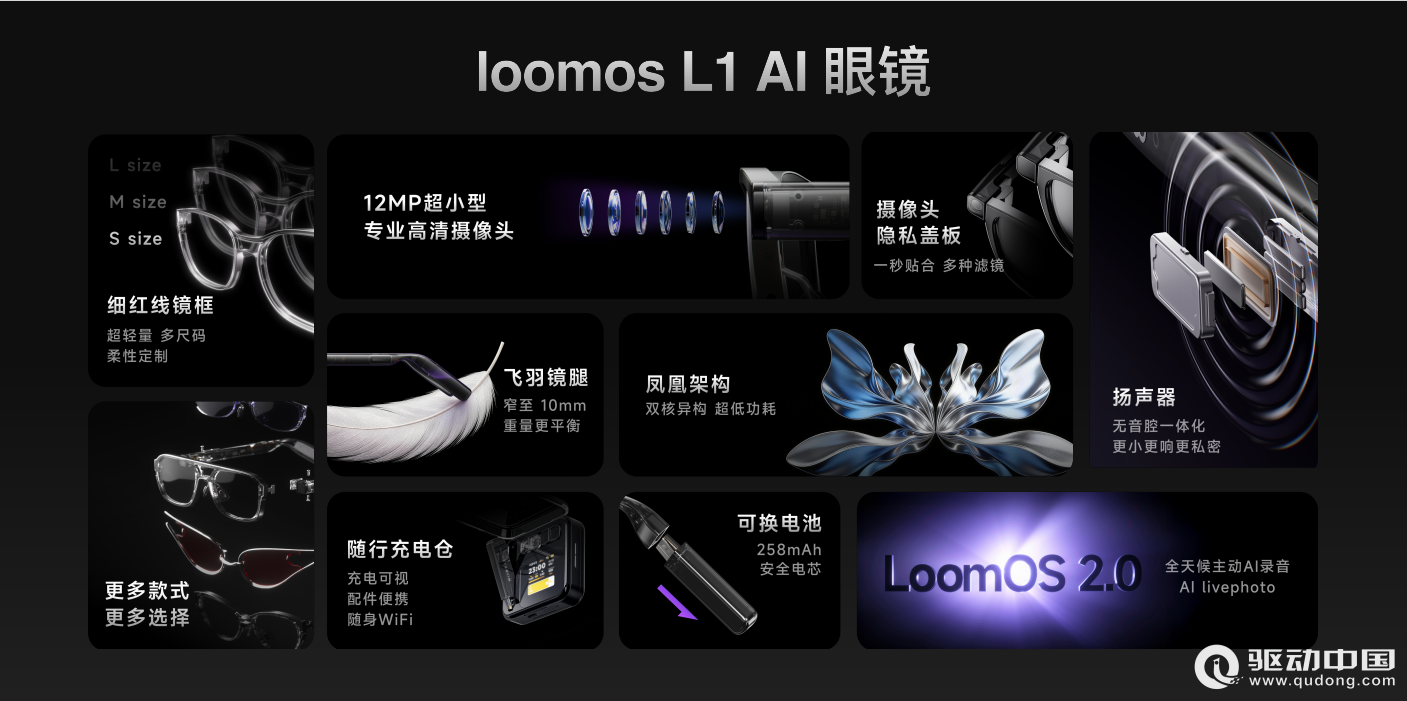 针对市面上AI眼镜在舒适度、外观、配镜等方面的用户痛点,闪极提出“AI眼镜应先成为一副美观舒适的日常眼镜”的产品主张。基于此,闪极发布“loomos 录眸 AI眼镜基座平台”及“闪极 loomos AI拍摄眼镜 L1”(以下简称:闪极 L1)。